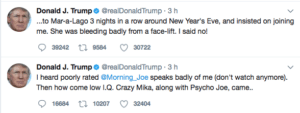 Donald Trump ha scritto due tweet in cui lancia un attacco abbastanza pesante contro la giornalista Mika Berezinski, coconduttrice del popolare programma mattutino statunitense Mornink Joe, in onda sull’emittente MSNBC. Dopo aver accusato il programma di aver parlato male di lui, Trump ha definito la giornalista “dal basso quoziente intellettivo” e detto “che sanguina dal suo lifting in faccia”.
