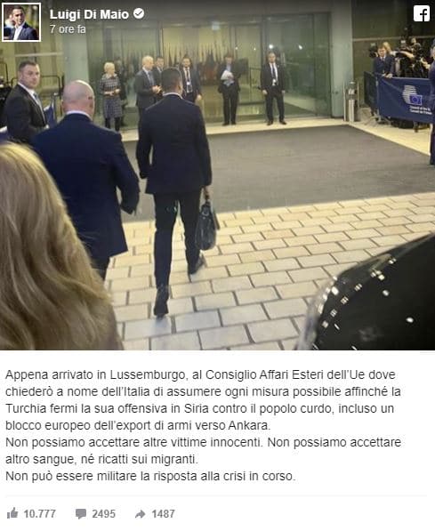 ore 13, 32 – Il consiglio Ue in Lussemburgo contro la vendita di armi in Turchia. “È stato un Consiglio degli Esteri molto importante in cui la richiesta dell’Italia era a tutti gli Stati europei nel futuro a bloccare l’export per gli armamenti verso la Turchia, perché non possiamo accettare quello che sta facendo. L’Europa oggi parla con una voce e tutti gli Stati condannano quello che la Turchia sta facendo nel territorio siriano e soprattutto si sono impegnati tutti a bloccare l’export degli armamenti”. Così il ministro degli Esteri Luigi Di Maio a margine del Consiglio Ue.