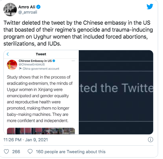 Twitter ha anche cancellato un post dell’ambasciata cinese negli Usa nel quale si leggeva che le donne uigure si erano “emancipate” grazie alle politiche attuate nella regione dello Xinjiang, dove invece si sospetta che Pechino abbia costretto alla sterilizzazione o a pratiche contraccettive numerose donne per frenare la crescita della popolazione. Riporta Repubblica.