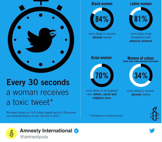 Amnesty ha analizzato, grazie all’intelligenza artificiale di Element AI, i tweet rivolti nel 2017 a 778 politiche e giornaliste britanniche e statunitensi.
