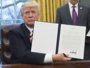 - Commercio: gli Stati Uniti escono dal Trattato transpacifico (TPP), grande accordo commerciale firmato nel 2015 da 12 stati (Australia, Brunei, Canada, Cile, Giappone, Malesia, Messico, Nuova Zelanda, Perù, Singapore, Vietnam e Stati Uniti, che ancora dovevano ratificalo). Obama si era impegnato nella stipulazione del trattato per costruire una stabile connessione commerciale tra USA ed Asia dell’est, in grado di competere anche con la Cina.