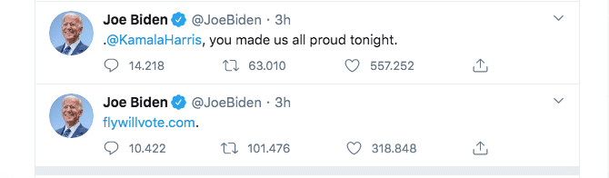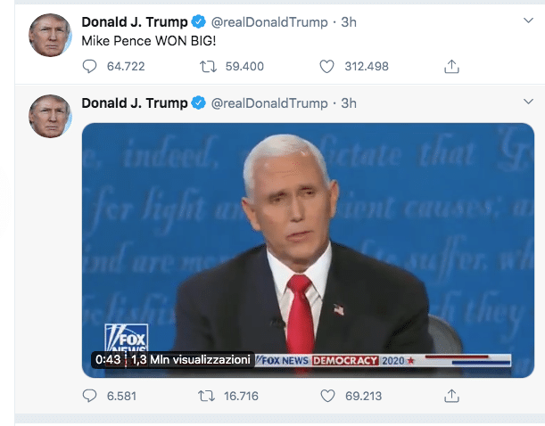 I candidati presidenti, dal canto loro, hanno tifato via Twitter nel corso del duello: “Kamala Harris sta dimostrando agli americani perché l’ho scelta come mia vice. È intelligente, ha esperienza e combatte per la classe media. Sarà una incredibile vicepresidente”, ha cinguettato Biden.