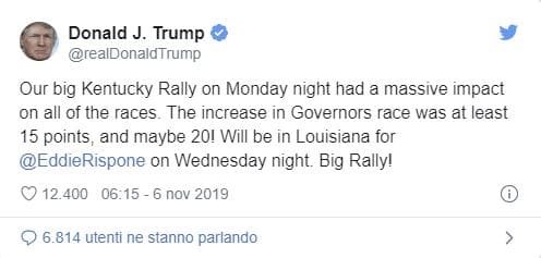 Durante un comizio lunedì in Kentucky, il Tycoon aveva esortato a rieleggere Bevin. Altrimenti “sarò accusato di aver incassato la peggiore sconfitta della storia del mondo”, aveva anticipato Trump. Sull’esito del voto pesa la scarsa popolarità del 52enne Bevin che ha ingaggiato una dura lotta contro sindacati e insegnanti. Il manager della campagna presidenziale di Trump, Brad Parscale, ha tenuto a sottolineare come il presidente sia riuscito a “trascinare” Bevin verso il traguardo, contribuendo al trionfo di altri canditati Gop nello Stato.