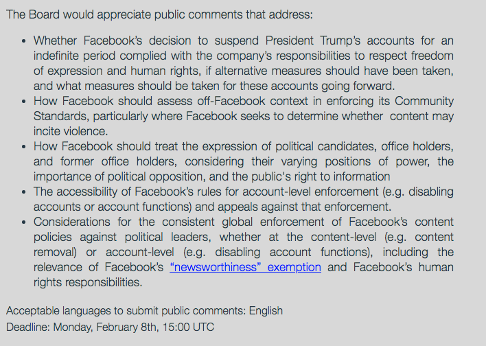 Ma sulla sospensione del profilo di Trump l’Oversight Board ha deciso a sua volta di rivolgersi al pubblico, e ha chiesto agli utenti di condividere il proprio parere con il comitato. Da oggi, lunedì primo febbraio, fino all’8 febbraio qualsiasi cittadino potrà compilare un modulo e scrivere in un massimo di 6mila caratteri cosa pensa della decisione di Facebook di rimuovere l’account dell’ex presidente degli Stati Uniti. In particolare, la commissione di sorveglianza chiede al pubblico di dire se “la decisione di Facebook di sospendere i profili del presidente Trump per un periodo indefinito aderisce al mandato dell’azienda di rispettare la libertà di espressione e i diritti umani, se dovevano essere prese altre misure e quali provvedimenti devono essere presi affinché questi account possano restare aperti”.
