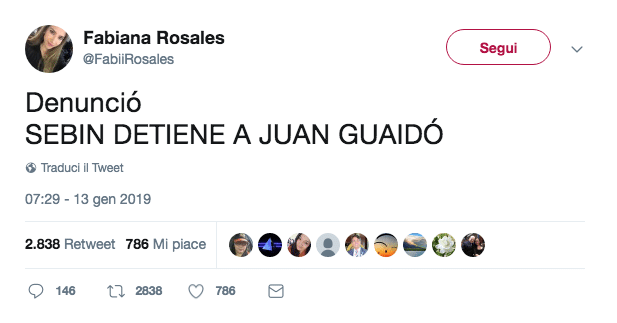 “Il Sebin (Servizio intelligence bolivariano, ndr) ha arrestato Juain Guaido”, ha scritto su twitter la moglie del leader d’opposizione, Fabiana Rosales.
