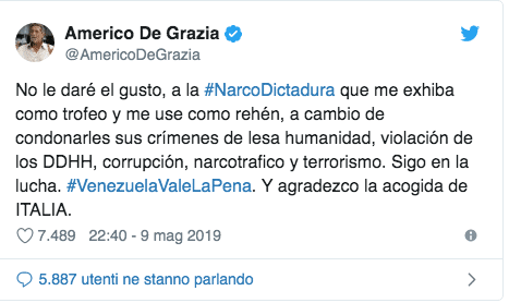 A renderlo noto è stato lui stesso tramite il suo account Twitter, in cui, oltre a ringraziare l’Italia ha ribadito la volontà di continuare a lottare per il suo paese, ribadendo il suo impegno per il Venezuela.
