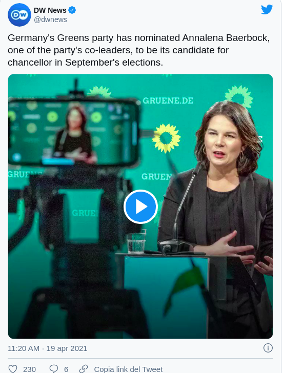 Il partito tedesco dei Verdi ha annunciato che alle prossime elezioni politiche che si terranno il 26 settembre 2021 candideranno la parlamentare Annalena Baerbock all’incarico da cancelliera, oggi ricoperto da Angela Merkel. Baerbock è l’altra persona oggi alla guida del partito insieme a Robert Habeck.