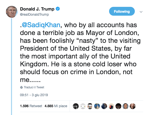 Su Twitter, Trump ha parlato del sindaco di Londra, Sadiq Khan: “Non lo apprezzo molto. Penso che sia il gemello di de Blasio, tranne per il fatto che è più basso”, ha scritto il tycoon.