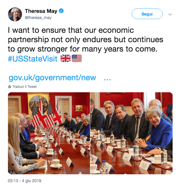 Il 4 giugno l’inquilino della Casa Bianca, dopo aver incontrato il giorno prima la regina Elisabetta II, è stato ricevuto a Downing Street dalla premier dimissionaria Theresa May.