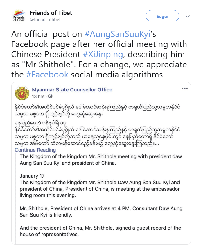 Una traduzione errata che non è passata inosservata. Xi Jinping, dal birmano all’inglese, è stato tradotto con il termine “Mr Shithole”.