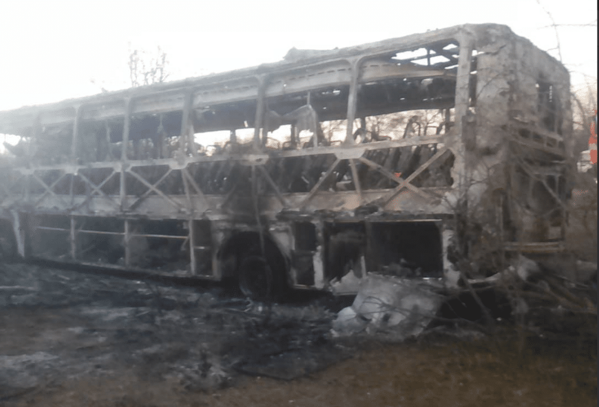 Le foto pubblicate su Twitter dalla Croce Rossa dello Zimbabwe mostrano i resti di un autobus incenerito.