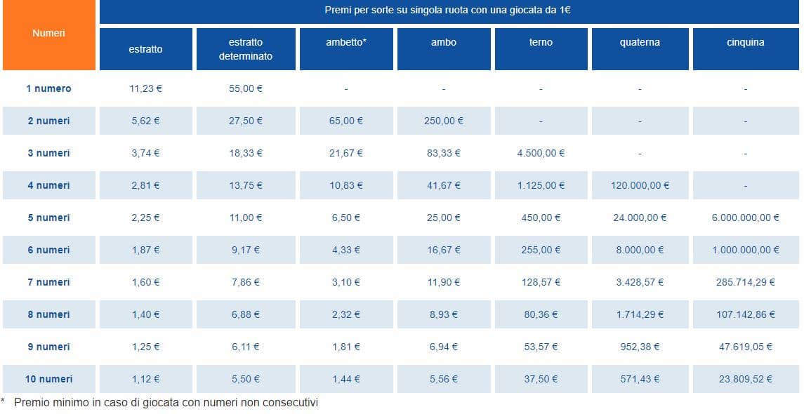 Non essendoci premi fissi, dunque, per capire quanto è possibile vincere si può fare riferimento a una tabella, pubblicata sul sito Lottomatica, che riporta, per una giocata su una singola ruota, quanto si vincerebbe per ognuna delle possibili combinazioni, puntando un euro.