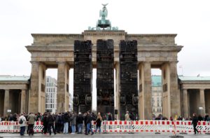 Cosa ci fanno tre autobus in posizione verticale davanti alla Porta di Brandeburgo, a Berlino