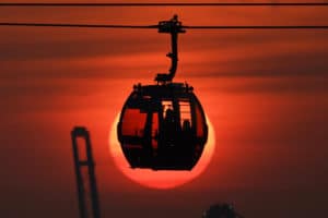 2. Una funivia si staglia davanti al sole che tramonta a Singapore. Credit: Roslan Rahman / Afp