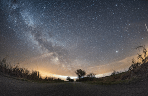 1. La via lattea e l’annuale pioggia di Liridi viste nel cielo notturno sopra Burg auf Fehmarn, sull’isola di Fehmarn, nel nord della Germania, sul Mar Baltico, il 20 aprile 2018. Credit: Daniel Reinhardt / Dpa / Afp