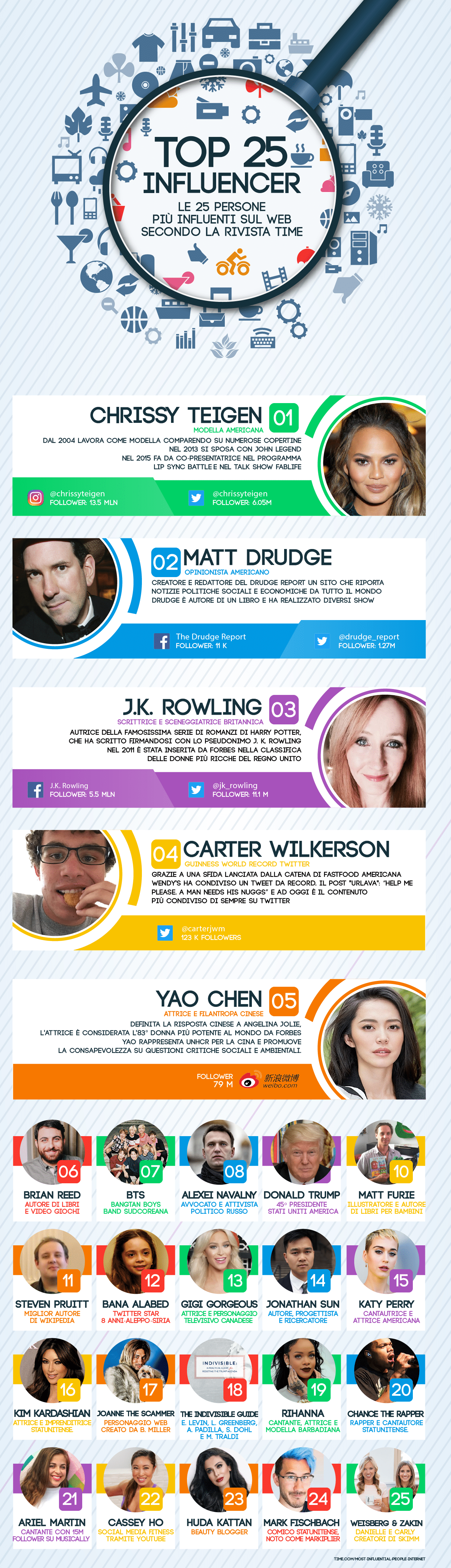 Come ogni anno, la rivista statunitense Time ha stilato la lista delle persone più influenti sul web, basata sulla presenza sui social network, sulla capacità di influenzare l’opinione pubblica in rete e sull’abilità nel dare visibilità a determinate notizie.