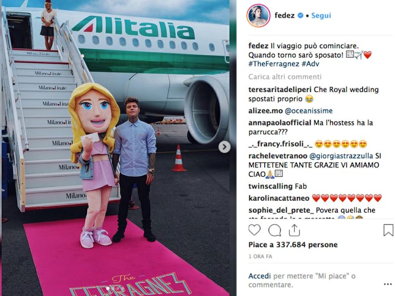 Il volo è partito dall’aeroporto di Milano Linate e ha portato il futuro sposo e gli ospiti in Sicilia. La compagnia aerea ha allestito un intero gate con tanto di biglietto aereo personalizzato, bambola gigante con le sembianze della sposa e gadget di bordo firmati Alitalia e Ferragnez.