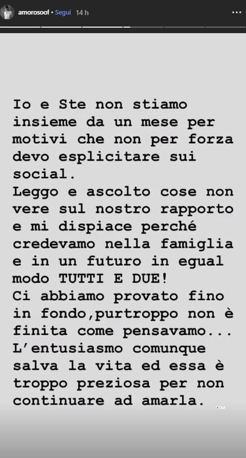 “Io e Ste non stiamo insieme da un mese per motivi che non per forza devo esplicitare sui social. Leggo e ascolto cose non vere sul nostro rapporto e mi dispiace perché credevamo nella famiglia e in un futuro in egual modo tutti e due! Ci abbiamo provato fino in fondo, purtroppo non è finita come pensavamo… L’entusiasmo comunque salva la vita ed essa è troppo preziosa per non continuare ad amarla”, ha commentato Amoroso sui social.
