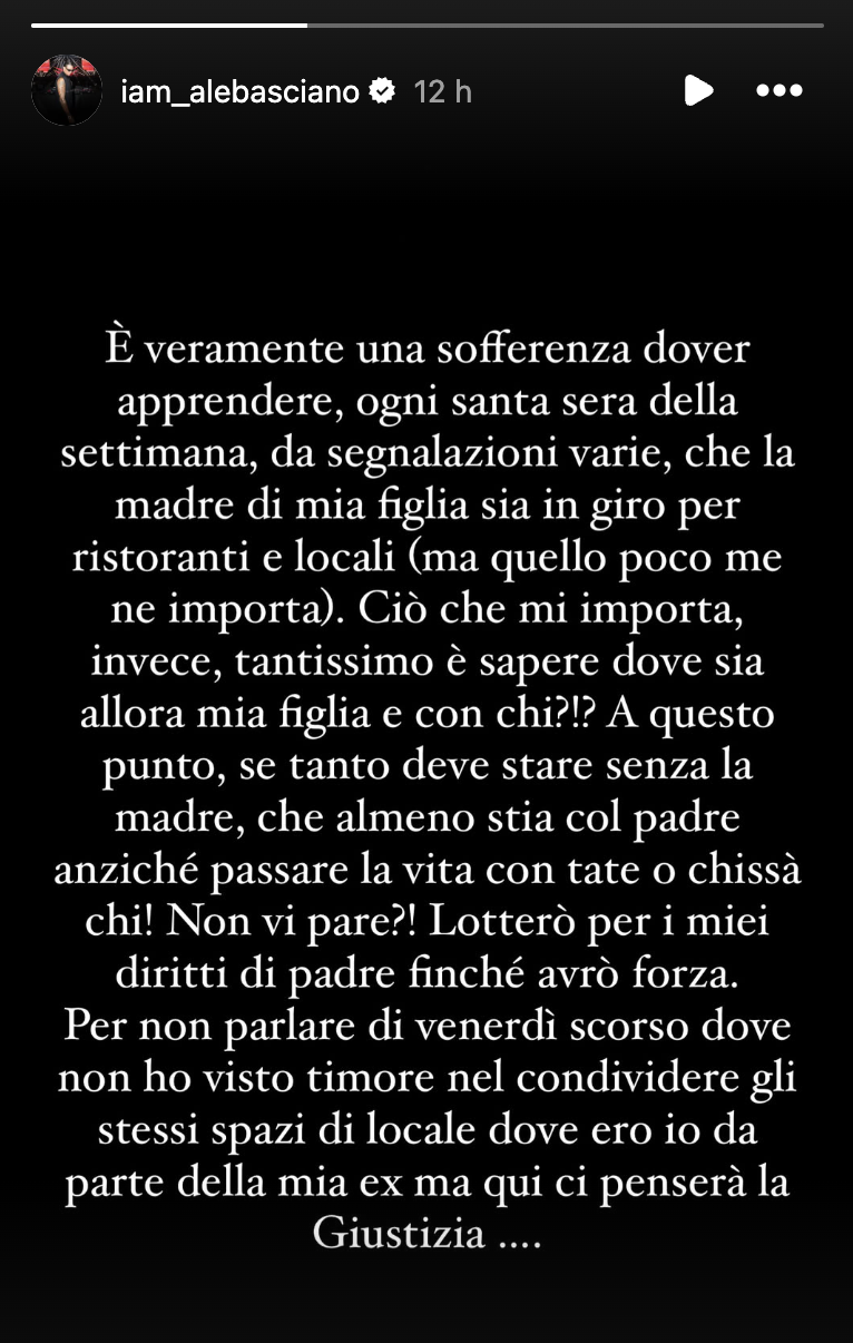 Alessandro Basciano aveva già accusato l’ex compagna di non stare abbastanza con la figlia. Sempre sui socia, infatti, il dj aveva scritto di recente: “In questo momento sono felicemente con mia figlia. Ma non per ‘gentile concessione’ solo perché se non fossi andato a prenderla io a scuola, nonostante non stia bene, sarebbe rimasta lì la piccola”.
