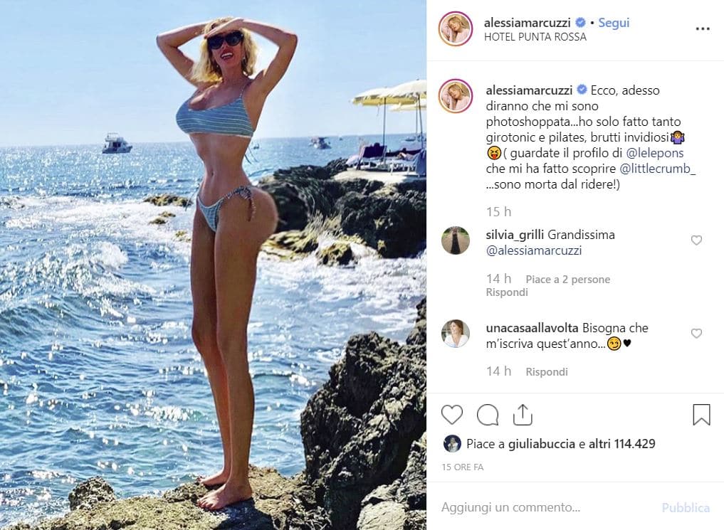 “Ecco, adesso diranno che mi sono photoshoppata… ho solo fatto tanto girotonic e pilates, brutti invidiosi🤷‍♀️😝 (guardate il profilo di @leleponsche mi ha fatto scoprire @littlecrumb_…sono morta dal ridere!)”, scrive Alessia Marcuzzi nella didascalia che accompagna la foto.
