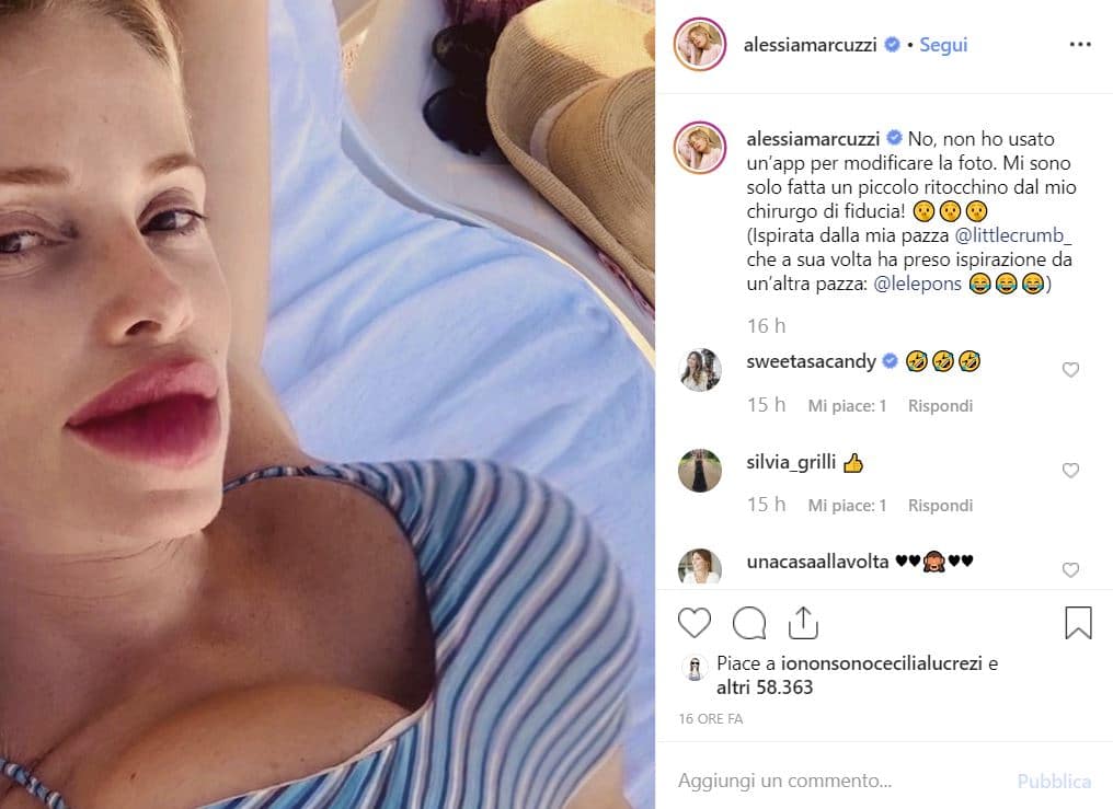 Ma quello non è l’unico scatto modificato postato dalla showgirl romana. Infatti basta scorrere l’account di Alessia Marcuzzi per notare un altro scatto altrettanto esilarante in cui la showgirl si mostra in primo piano e contesta l’uso di Photoshop. Le sue labbra sono esageratamente gonfie, risultato di un “ritocchino”.