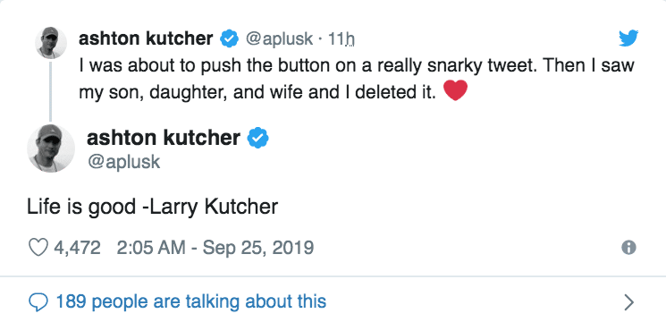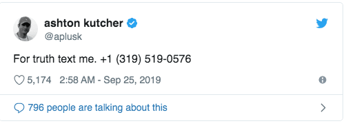 L’attore, 41 anni, ha esortato i fan su Twitter a “mandargli un sms per scoprire la verità”. E, parlando di Demi Moore ha dichiarato: “Ho resistito a pubblicare un tweet cattivo per il bene della sua famiglia – la moglie Mila Kunis e il loro figli Wyatt, 4 anni, e Dimitri, 2.