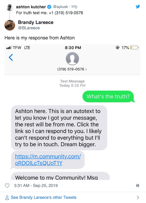 Altri utenti hanno invece risposto al tweet in cui l’attore pubblicava il numero di telefono e hanno inviato un sms per “scoprire la verità”. La risposta proviene da un sistema automatico collegato a una piattaforma di messaggistica chiamata Community.