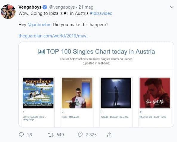 Il gruppo pop dei Vengaboys ha espresso la sua gioia su Twitter: “Wow, Going to Ibiza primo in classifica in Austria. Hey, @janboehm dobbiamo ringraziare te?!” scrive sul suo account Twitter sabato 18 maggio.