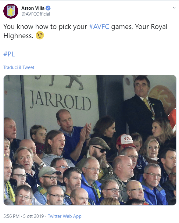 Anche la squadra ha apprezzato. In un tweet dell’account ufficiale dell’Aston Villa si legge “Sua altezza reale sa scegliere bene le partite da vedere”.