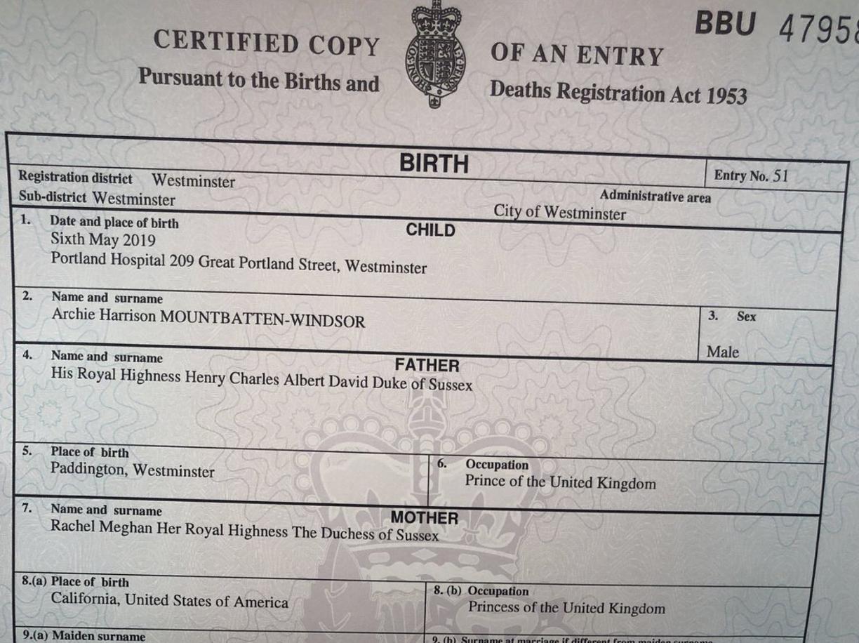Il certificato di nascita di Archie è stato registrato solo 11 giorni dopo la sua nascita. Nel Regno Unito, i genitori hanno 42 giorni per registrare la nascita di un bambino.