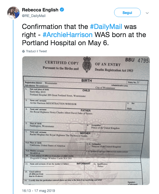 Il certificato di nascita del figlio di Meghan e Harry è stato diffuso sui social dalla giornalista del Daily Mail, Rebecca English.
