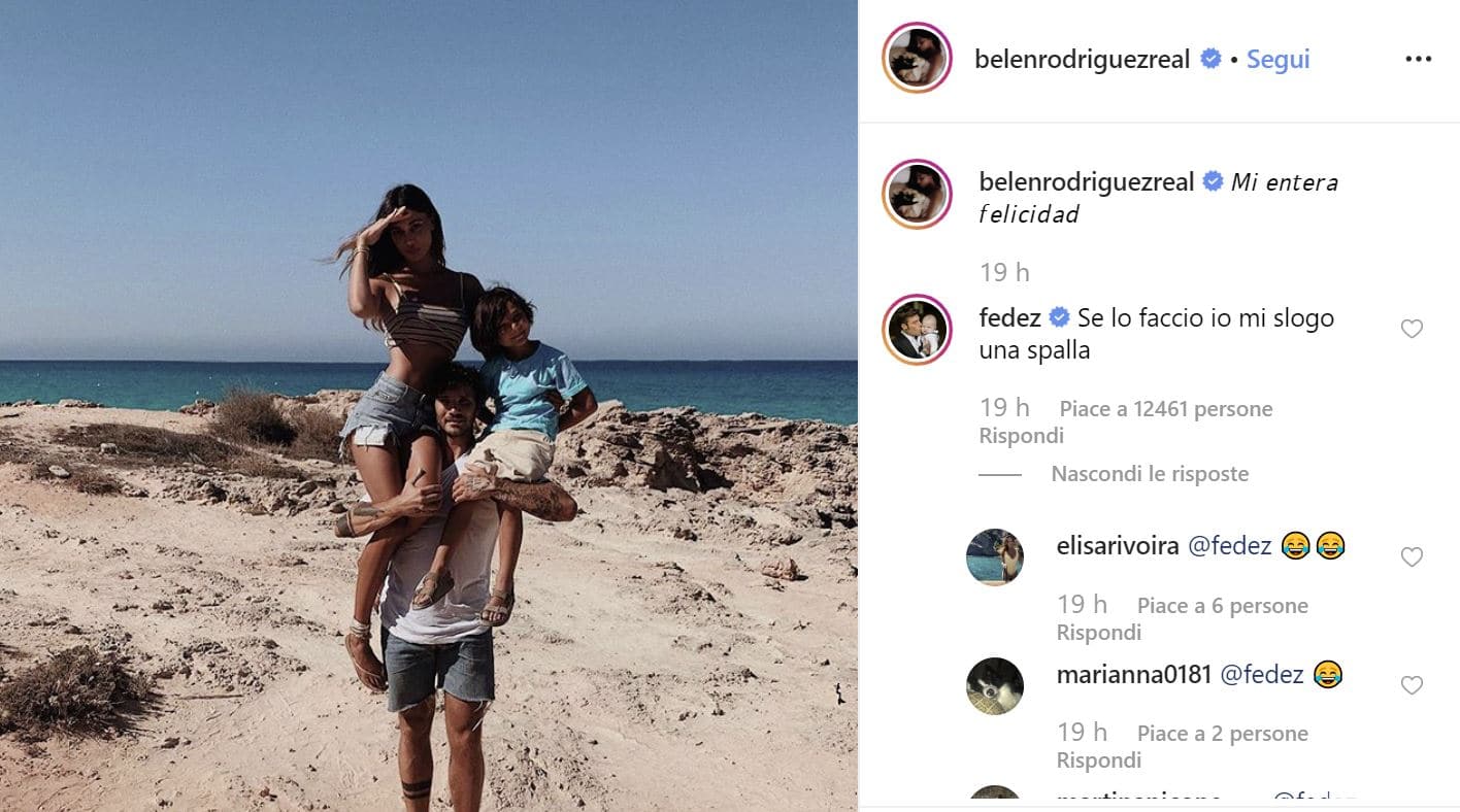 Proprio sotto una degli ultimi scatti postati dalla showgirl argentina, spunta il commento di Fedez. Belen pubblica una foto insieme al marito Stefano e al figlio Santiago. In effetti la scena è piuttosto particolare: il ballerino tiene sulle spalle, in un equilibrio perfetto e impressionante, da un lato il bambino (ormai grandicello) e dall’altra la moglie.
