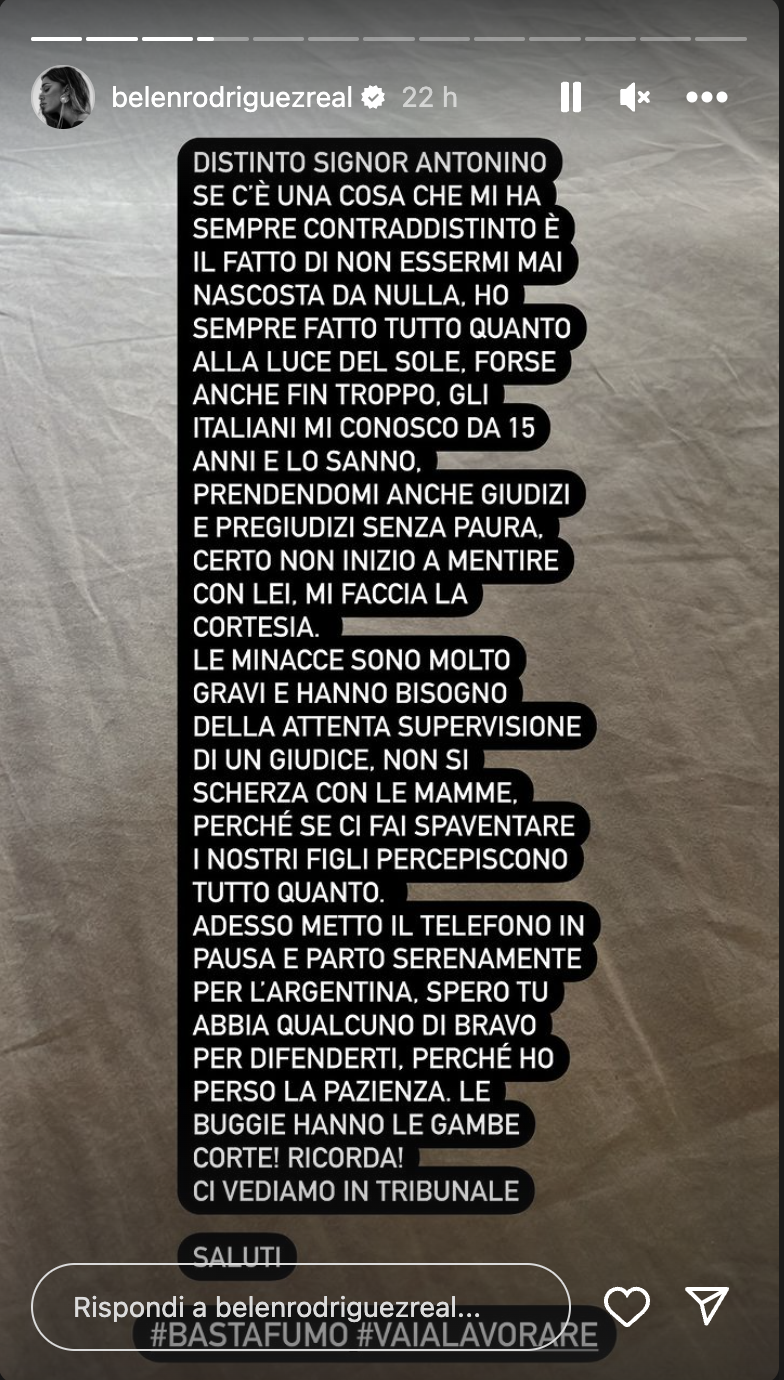 “Non si scherza con le mamme, perché se ci fai spaventare i nostri figli percepiscono tutto quanto. Adesso metto il telefono in pausa e parto serenamente per l’Argentina. Spero tu abbia qualcuno di bravo per difenderti, perché ho perso la pazienza. Le bugie hanno le gambe corte! Ricorda! Ci vediamo in tribunale. Adesso basta, troppa importanza, l’ho fatto perché non permetto a nessuno più di mandarmi sotto terra. Adesso torna al posto tuo” ha concluso la showgirl argentina aggiungendo poi gli hashtag “#BastaFumo” e “#VaiALavorare”.