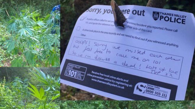 La polizia britannica di Thames Valley ha trovato una piantagione di marijuana in una zona rurale di Oxford, Regno Unito, e ha deciso di ironizzare sull’accaduto lasciando un biglietto divertente su un palo recante la scritta: