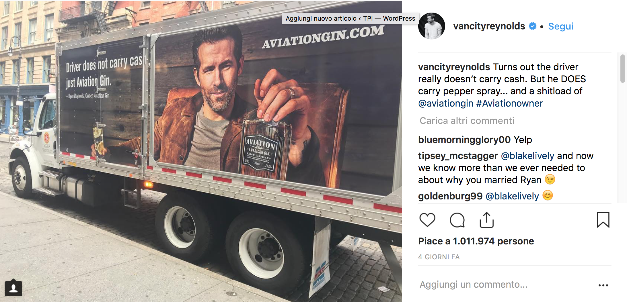 E così, con un simpatico botta e risposta i due hanno dato da divertire ai follower. Tutto è iniziato su Instagram, dove l’attore e produttore statunitense ha pubblicato una foto in cui era ritratto un camion con la pubblicità dell’Aviation Gin, marca di alcolici di cui Reynolds è testimonial e, soprattutto, produttore.