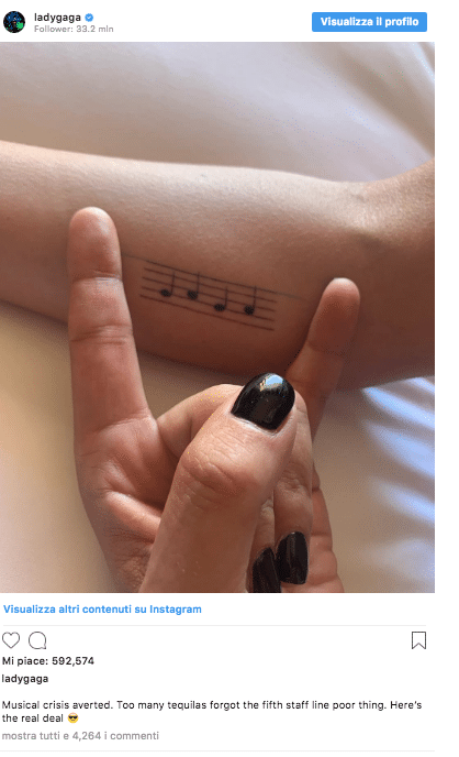 L’altro tatuaggio “incriminato”, la cui foto è stata postata qualche giorno sempre su Instagram, vede alcune note musicali disegnate su un pentagramma incompleto perché di sole quattro righe. Nella didascalia dell’immagine si legge “Piccola crisi musicale. Troppe tequila hanno fatto dimenticare la quinta linea del pentagramma”.