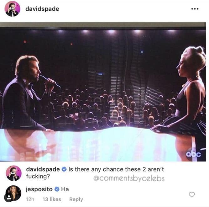L’attrice è entrata a gamba tesa nel triangolo Lady Gaga-Bradley Cooper-Irina Shayk commentando una foto con un quanto mai indicativo “Ha”, sotto una foto dei due al pianoforte postata dall’attore comico David Spade, che scriveva: “C’è qualche possibilità che questi due non facciano sesso?”.