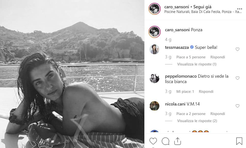 Pochi giorni fa, sempre dall’isola, Carolina Sansoni aveva condiviso uno scatto molto simile, in cui è stesa su un pareo e lascia intravedere una parte del seno, in bianco e nero.