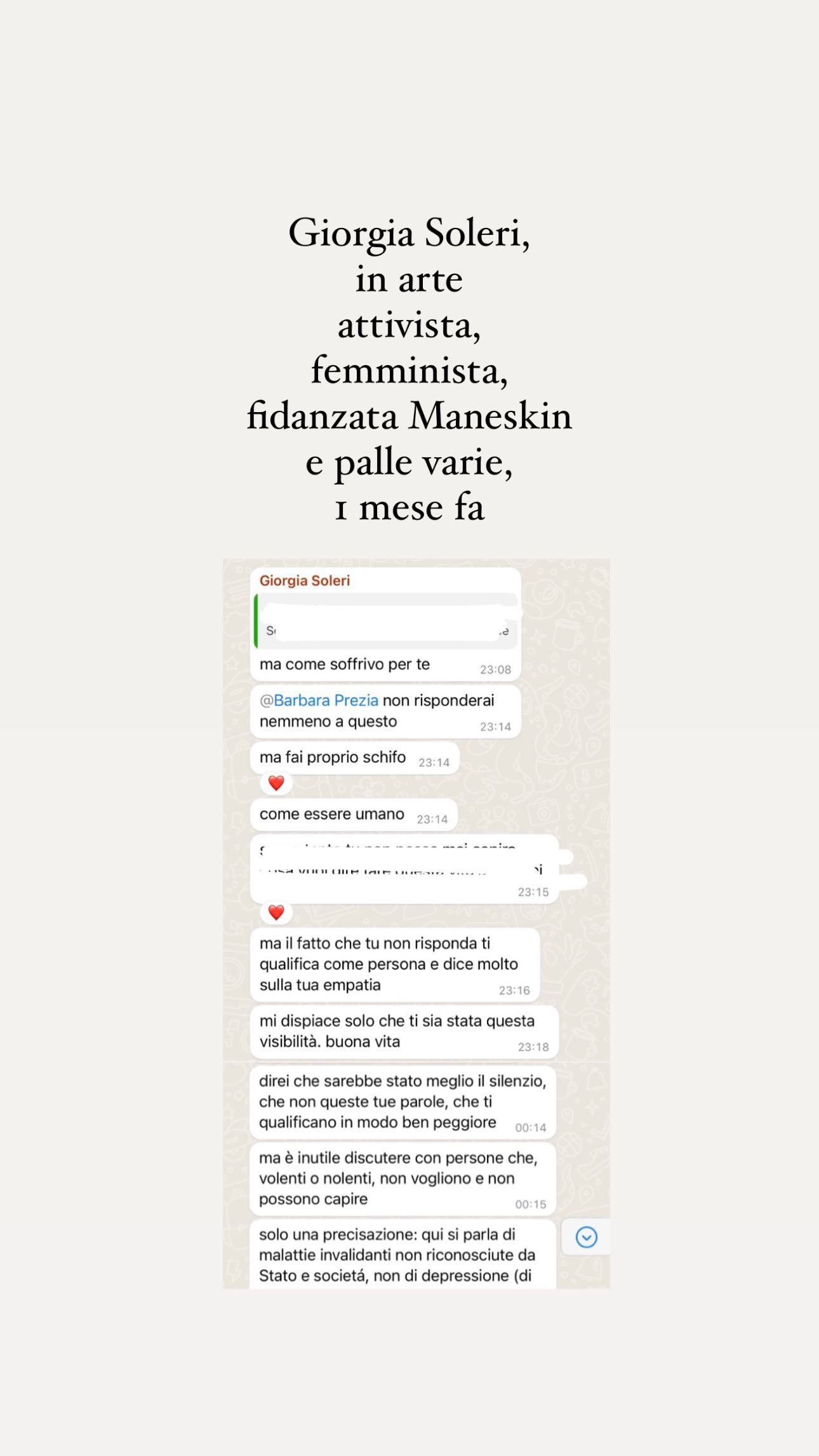 “Giorgia Soleri, in arte attivista, femminista, fidanzata Maneskin e palle varie, 1 mese fa” ha scritto su Instagram Carolina Stramare condividendo la chat in cui l’influencer, rivolgendosi a Barbara Prezia, scriveva: “Mi fai proprio schifo come essere umano”.