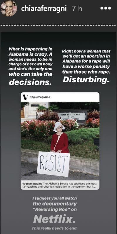 È successo il 14 maggio con la questione di taxi e uber ed è capitato ancora il giorno dopo. Il 15 maggio Chiara Ferragni ha pubblicato una storia sul suo account Instagram per commentare la decisione dello stato statunitense dell’Alabama di vietare l’aborto.