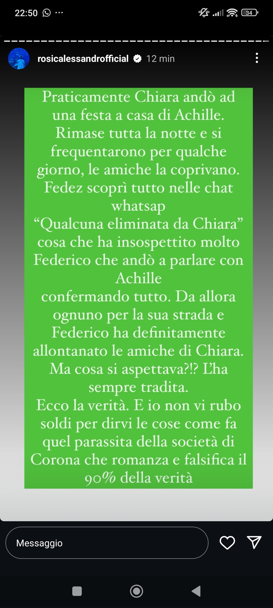 In una stories sul suo profilo Instagram, infatti, l’esperto di gossip ha scritto ciò che sarebbe accaduto: “Chiara andò ad una festa a casa di Achille. Rimase tutta la notte e si frequentarono per qualche giorno, le amiche la coprivano. Fedez scoprì tutto nelle chat WhatsApp ‘Qualcuna eliminata da Chiara’ cosa che insospettì molto Federico che andò a parlare con Achille confermando tutto. Da allora ognuno per la sua strada e Federico ha definitivamente allontanato le amiche di Chiara. Ma cosa si aspettava? L’ha sempre tradita”.
