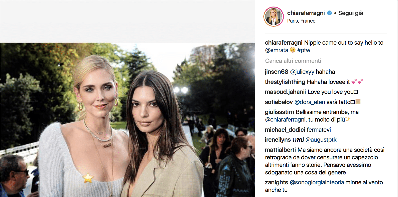 La Ferragni ha usato il piccolo fuori programma per fare ironia: su Instagram, in una foto da oltre 500mila like, ha scritto: “Nipple came out to say hello to Emily Ratajkowski” (“Il capezzolo è uscito per salutare Emily Ratajkowski”). Il capezzolo è stato “censurato” con una stellina.