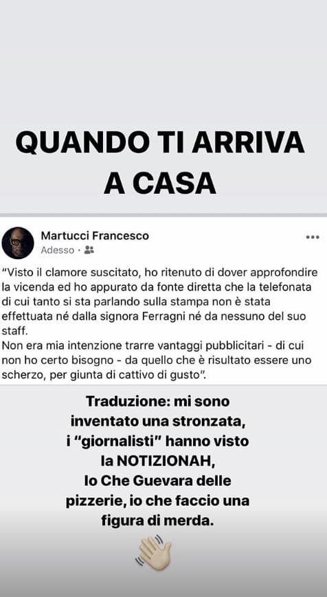 “Buongiorno da Los Angeles, stiamo cercando qualcuno che ci ospiti in una pizzeria di Caserta, grazie”, così Fedez prende in giro il pizzaiolo di Caserta che ha raccontato di aver respinto lui e Chiara Ferragni dal suo locale quando la coppia ha chiesto di accomodarsi in un privé: ma sembra che si è trattato di una bufala.