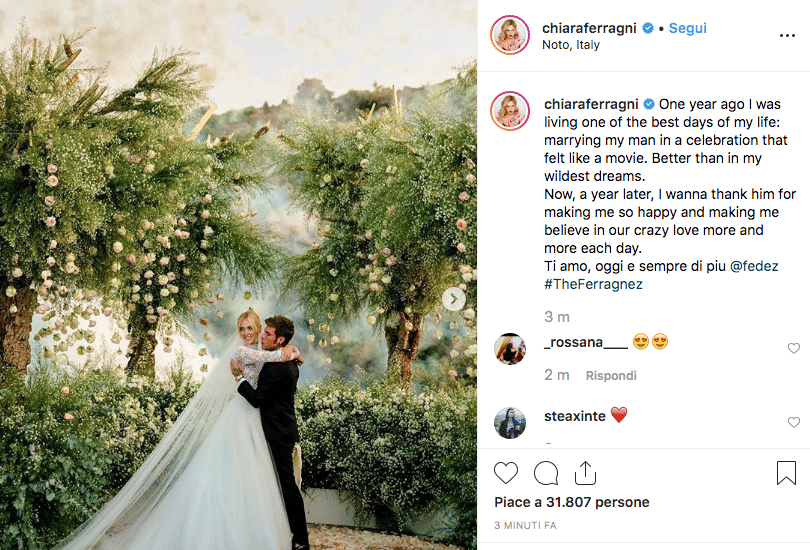 È la commovente dedica fatta da Chiara Ferragni a Fedez nel primo anniversario del loro matrimonio. La fashion blogger ha scritto queste parole in un post pubblicato sul suo profilo Instagram.
