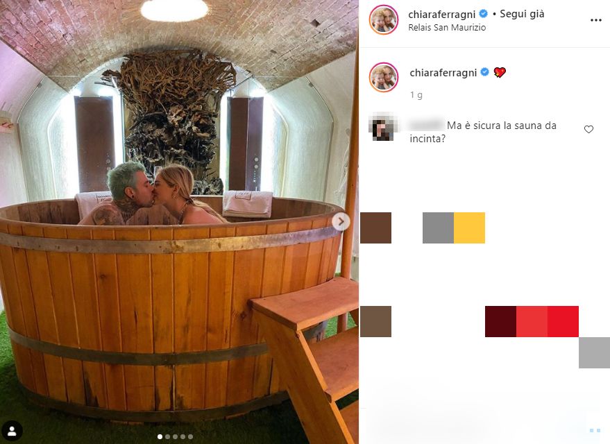 Altri hanno poi notato una bottiglia di champagne con due bicchieri adagiati vicino la vasca (anche se uno dei due bicchieri è vuoto). “È giusto godersi un po’ di relax, ma state attenti. Fatelo per il bambino”, si legge ancora tra i commenti. “Ma è sicura la sauna da incinta?”, ha scritto un altro e qui la Ferragni è intervenuta, specificando: “No, infatti quella non l’ho fatta”.