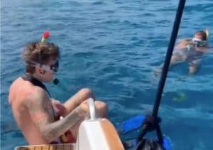 Il programma di lunedì prevedeva il bagno con gli squali e così è stato. Solo che il risultato è stato piuttosto ironico, soprattutto per la reazione del rapper milanese. Una volta arrivati a largo accompagnati dalla guida locale, i due si sono fermati nel bel mezzo dell’azzurro del mare, pronti a tuffarsi.