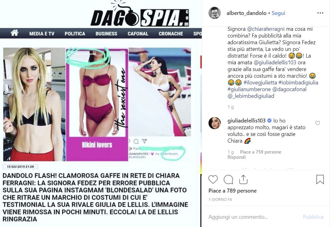 Dandolo ha pubblicato lo screenshot dello scivolone della Ferragni su Instagram e accanto ha scritto: “Signora Chiara Ferragni, ma cosa mi combina? Fa pubblicità alla mia adoratissima Giulietta? Signora Fedez stia più attenta, La vedo un po’ distratta! Forse è il caldo! 😅😂! La mia amata Giulia De Lellis ora grazie alla sua gaffe farà vendere ancora più costumi a sto marchio!”.