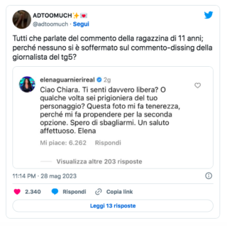 Tra gli utenti che hanno espresso il loro parere sullo scatto tanto divisivo c’è stato anche un altro volto noto al pubblico televisivo: Elena Guarnieri, giornalista e conduttrice del Tg5 che a Chiara Ferragni ha rivolto una pungente domanda. “Ciao Chiara. Ti senti davvero libera? O qualche volta sei prigioniera del tuo personaggio? Questa foto mi fa tenerezza, perché mi fa propendere per la seconda opzione. Spero di sbagliarmi. Un saluto affettuoso. Ele”, ha scritto la giornalista che già in passato, proprio sui social, si era rivolta all’imprenditrice circa il suo ruolo di madre nostalgica del figlio Leone che allora aveva pochi mesi.