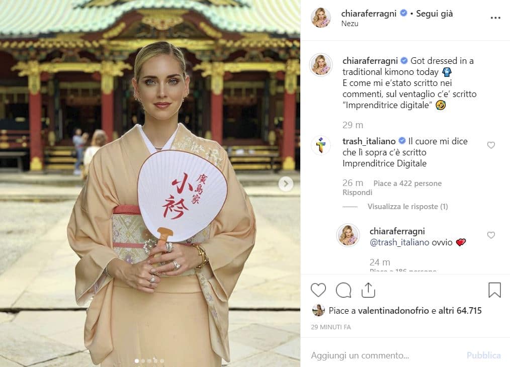 Accanto alle foto in cui l’influencer appare nel suo abito “particolare”, Chiara Ferragni scrive: “Oggi ho indossato un kimono tradizionale. E come mi è stato scritto nei commenti, sul ventaglio c’è scritto ‘Imprenditrice digitale'”, scherza l’influencer.