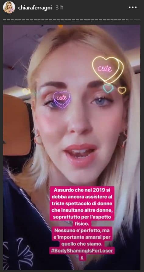 “Assurdo che nel 2019 si debba ancora assistere al triste spettacolo di donne che insultano altre donne, soprattutto per l’aspetto fisico. Nessuno è perfetto, ma è importante amarsi per quello che siamo”, scrive Chiara Ferragni in una storia.